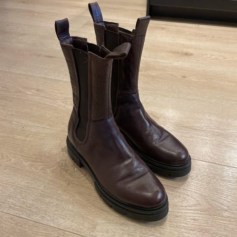 Selger ett par ubrukte Ecco skoletter i størrelse 40. Støvlene er i brunt skinn med sorte elastiske felt i sidene for enklere av- og påtaking. Grov, mønstret yttersåle i gummi gir godt grep.