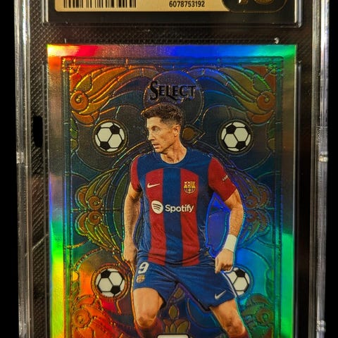 Topps 2023-24 FC Barcelona Robert Lewandowski samlekort i varianten Orange Foil. Kortet viser Robert Lewandowski i FC Barcelona-drakt på forsiden, med spillerinformasjon og tekst på baksiden. Kortet er innkapslet og gradert av CSG (Certified Guaranty Company) med karakter 10 (Gem Mint). Egnet for samlere av fotballkort, spesielt FC Barcelona- og Robert Lewandowski-samlinger, samt moderne Topps-kort fra sesongen 2023-24.