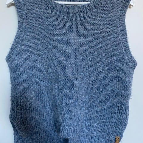 Strikkevest for dame i størrelse S. Vesten er strikket i børstet alpakkaull og har en fersken hovedfarge med lys mønsterbord nederst. Ermeløs modell med rund hals, egnet til lag-på-lag bruk over skjorte, genser eller kjole.
