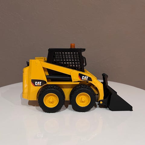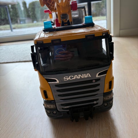 Bruder leketøysgravemaskin traktor i gul plast. Modellen har bevegelig graverarm og skuffe foran og bak, samt tippbar lasteplan. Kjøretøyet har fire hjul og førerhus i svart plast. Egner seg som anleggskjøretøy i lek med sand eller andre materialer, både inne og ute, avhengig av underlag og værforhold.
