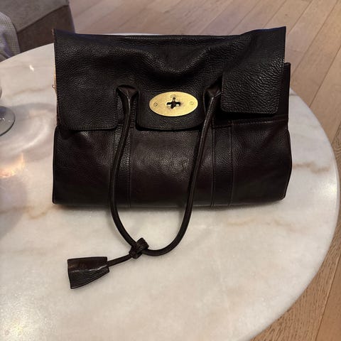 Mulberry skinnveske for dame. Vesken er laget i glatt lær i en lys brun/kamel-farge. Den har doble hanker, karakteristisk frontklaff med metall-lås og avtagbar skinnrem med nøkkelhylster. Sideløsning med reimer og spenner gir mulighet for noe justering av veskens vidde. Passer som hverdagsveske eller til kortere reiser, med god plass til personlige eiendeler.