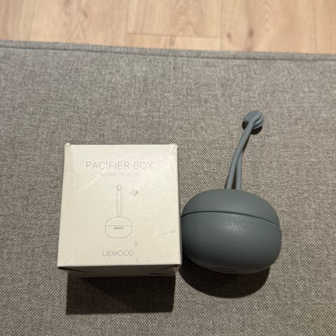 Oppbevaringsboks til smokk, i silikon. Ble aldri tatt i bruk.