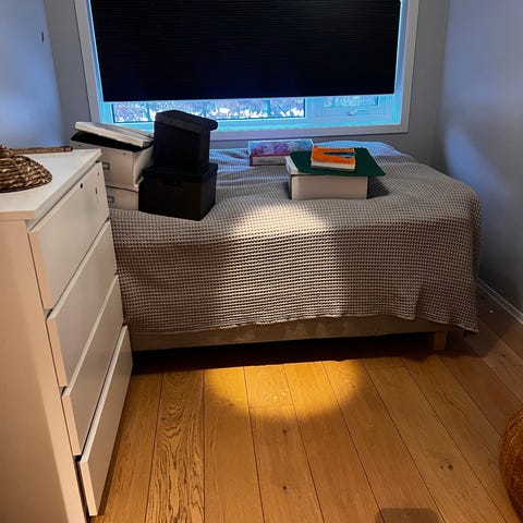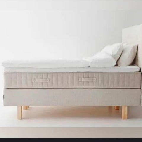 IKEA seng i grått tekstiltrekk(160*200). Sengen har rett hodegavl og står på ben. Rammen er i treverk med tverrbjelker for støtte. Madrass følger med, med lyst trekk. Passer som vanlig seng i soverom eller gjesterom. Må hentes av kjøper i Eidsvoll.