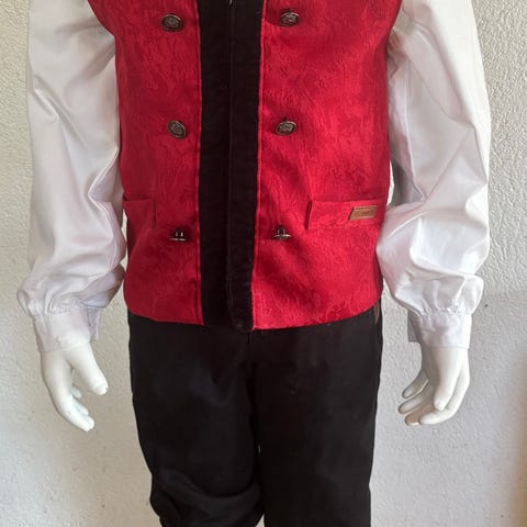 Bunads festedrakt sett i størrelse 110. Settet består av skjorte 4-5 år vest 5 år og bukse 5 årSkjorten 4-5 årer lys med lange ermer og mansjetter. Vesten 5 år er hovedsakelig blå med mørke detaljer og knapper foran, samt regulerbar stropp bak. Buksen er mørk og og går til under kneet, med detaljer ved kneet. Passer til gutt i størrelse 110 eller 4-5 år kan brukes til høytider, selskaper eller andre anledninger der man ønsker et mer pyntet antrekk.