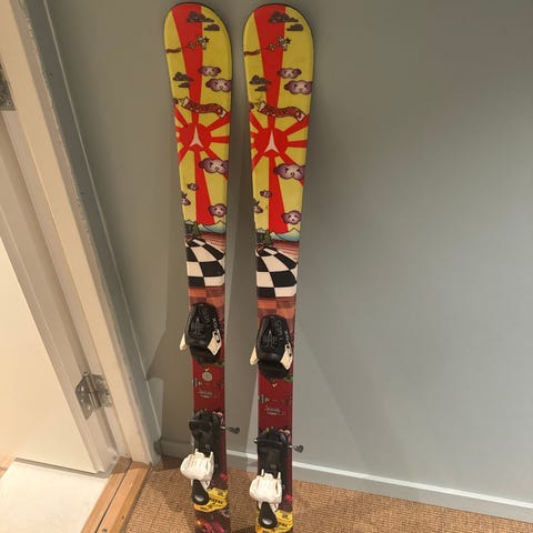 Leier ut et par twintip-ski med alpinstøvler i ca. størrelse 42/43.