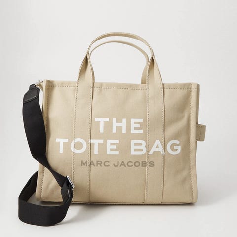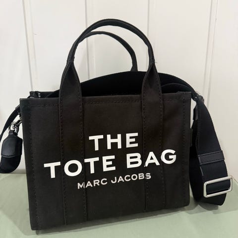 Marc Jacobs The Tote Bag stoffveske for dame i brun farge. Vesken er laget i kraftig stoffmateriale med doble bærehåndtak. Den har åpent hovedrom med glidelåslomme og flere mindre innvendige lommer for organisering. Utsiden har tydelig logo-trykk foran og merkeetikett bak. Egnet som hverdagsveske eller tote-bag til jobb, skole og fritid.