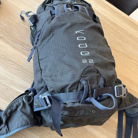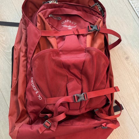 Osprey ryggsekk i rød farge. Sekken har polstret og ventilert ryggpanel, justerbare skulderstropper og hoftebelte med spenner for god tilpasning. Flere kompresjonsremmer og festepunkter på utsiden. Egnet til tur, friluftsliv og hverdagsbruk.