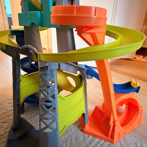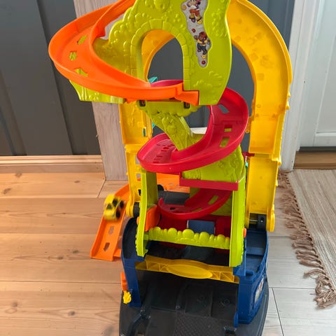 Fisher-Price bilbane. Lekesettet består av en høy bilbane med flere etasjer, svinger og ramper der små biler kan kjøre nedover. Banen kan brukes både stående i høyden og lagt ned, slik bildene viser.