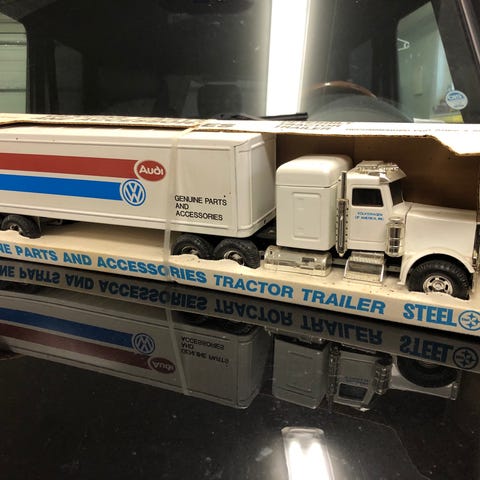 Peterbilt lastebilmodell av amerikansk trekkvogn med tilhørende semihenger. Modellen er utført i svart med kromdetaljer og dekor i rødt, hvitt og blått. Hengeren har motiv med amerikansk flagg og ørn på sidene. Modellen viser en klassisk langtransporttrekker med høy førerhytte, doble bakaksler og detaljer som eksosrør, drivstofftanker og felger i metallfinish.