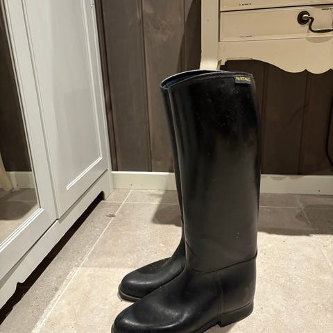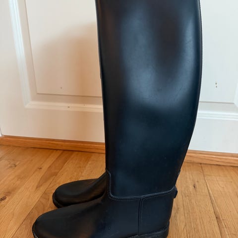 Mustang ridestøvler i svart kunstskinn og størrelse 39. Høye støvler som går opp til kneet, med glatt overflate og avrundet tupp. Egnet som klassiske ridestøvler til bruk i stall og på rideturer. Materialet fremstår som et glatt, syntetisk eller behandlet materiale med enkel rengjøring. Passer til ryttere som ønsker enkle, funksjonelle ridestøvler i nøytral svart farge.