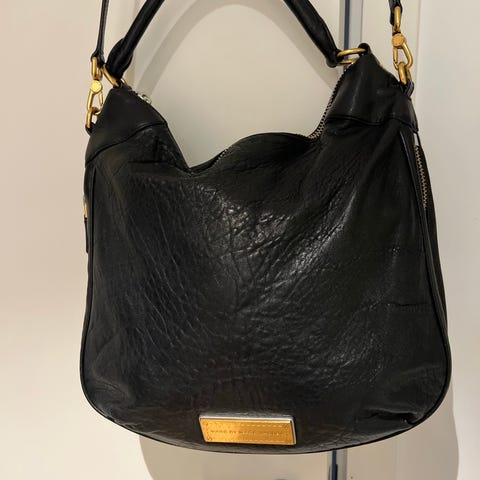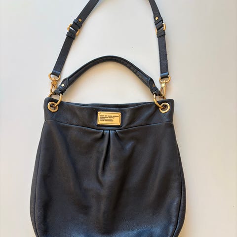 Marc Jacobs skulderveske i lær for dame. Vesken er laget i mykt blått skinn med justerbar skulderrem. Den har glidelåslukking øverst og et hovedrom med innerlomme med glidelås samt åpen innerlomme. Innvendig fôr i tekstil. En fuktflekk i innerforet, men ingen merker i skinnet.