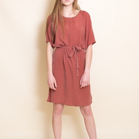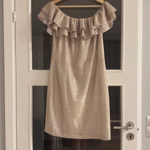Pent brukt. A-line kjole med V-hals. Jenta på bildet er 165 høy og bruker str xs. Knyting i rygg gjør at den kan justeres noe. Liten rift i splitten (kun i sømmen) er sydd.