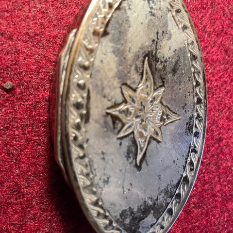 Sigarett-etui i sølvplett (merket Alp OSP 40). Fra cirka 1945-50. Gravert og merket med initialer B.L. Lukkemekanismen fungerer som den skal.