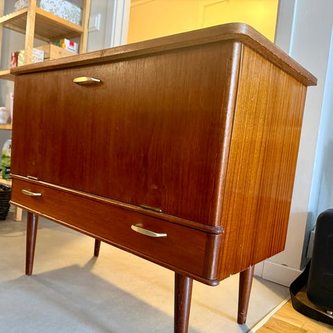 Koselig skap i teak. Messing nederst på bena.sorte skyvedører. Hull i bakeplate for kabler etc.