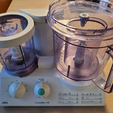 Bosch PowerMix kjøkkenmaskin i hvit utførelse. Maskinen har bolle i plast med lokk og materør, samt flere medfølgende tilbehørsdeler i plast og metall, blant annet innsatsdeler og damp-/kokekar i metall. Egnet til hakking, riving, blanding og annen mattilberedning på kjøkkenet. Effekt oppgitt på maskinen er 800 W. Maskinen er beregnet for bruk på kjøkkenbenk som allsidig kjøkkenmaskin/foodprosessor.