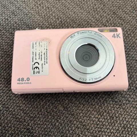 INF digitalkamera i rosa farge med 4K-videoopptak. Kameraet har utsmykning med små hjerter og stjerner på fronten. På baksiden er det en skjerm og betjeningsknapper for navigasjon i menyene. Skjermen kan vippes opp for enklere fotografering fra ulike vinkler, for eksempel ved selvportretter. Egnet til enkel foto- og videoopptak i hverdagen.