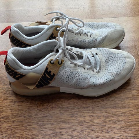 Nike invincible 3 i størrelse 46. Skoene har overdel i tekstil i en hvit farge med kontrastdetaljer i blant annet svart, gult og oransje. Modellen er laget for løping og har en kraftig mellomsåle med tydelig hælparti og yttersåle tilpasset bruk på hardt underlag som asfalt eller grus. Passer til løping og annen trening der det er behov for joggesko med demping.