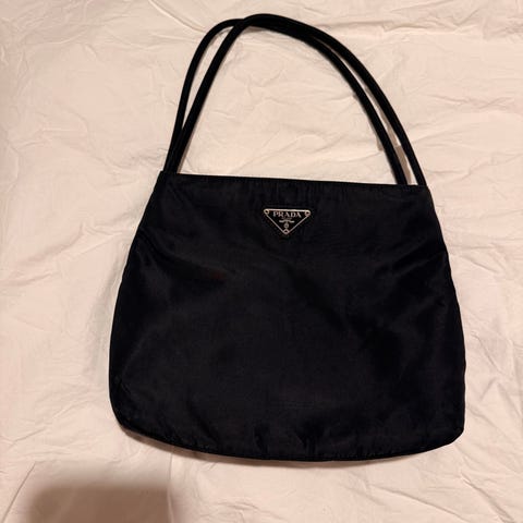 Prada Nylonveske selges. Vesken er i farge. mørkegrønn materiale men oppleves svart i de fleste lys. Vesken er kjøpt på 17th Street Vintage i New York. Følger med autentisitetskort fra Prada.