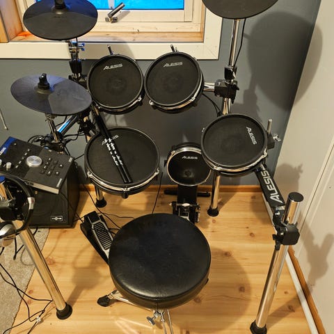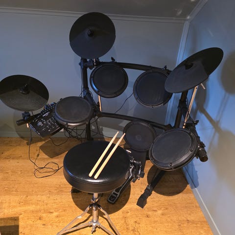 Følger også med: krakk, trommestikker, hodetelefoner og en liten forsterker som kan brukes sammen med trommesettet.