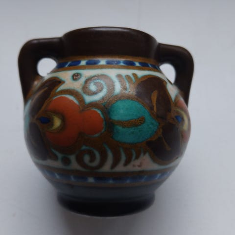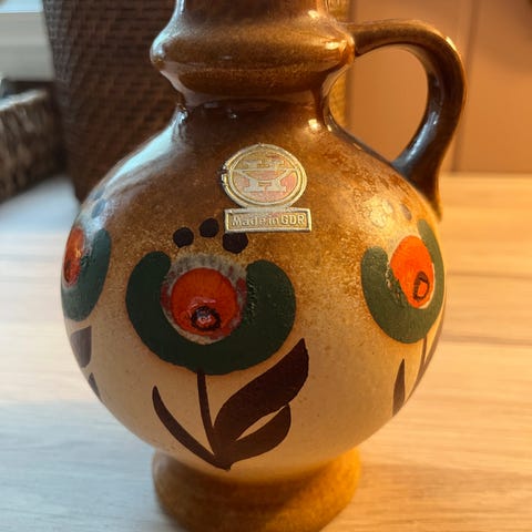 Gouda Holland Capri keramikkkanne i flerfarget glasur. Kannen har rund kropp, smal hals og hank, med dekorative mønstre i blant annet grønt, blått, hvitt og brunt. Bunnen er merket med «Capri Gouda Holland». Egner seg som bruksgjenstand eller dekorativ gjenstand i interiør.