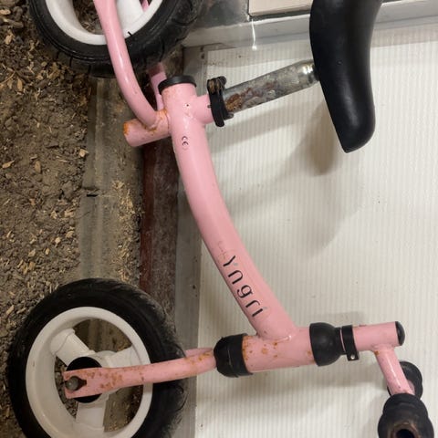 Løpesykkel for barn med 12" hjul. Sykkelen har rosa ramme i tre og hvite hjul. Egnet for barn som skal øve på balanse og koordinasjon før overgang til vanlig sykkel.