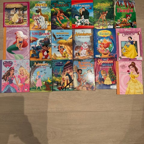 Bokpakke med fire Disney- bøker: Frost 2, Vaiana, Rapunzel og Mulan.