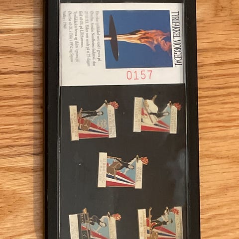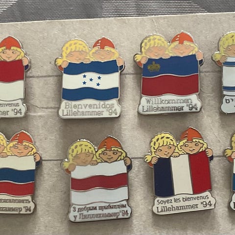 Lillehammer 94 Trofe OL-pins samling med flaggmotiv. Pinsene viser de offisielle OL-maskotene sammen med ulike nasjonsflagg og velkomsttekster på flere språk. Baksiden har preget Lillehammer ’94-logo, OL-ringer og produsentmerke Trofé of Norway. Egner seg som samleobjekt for OL- og pinssamlere, samt for visning i ramme eller på pinntavle.