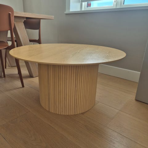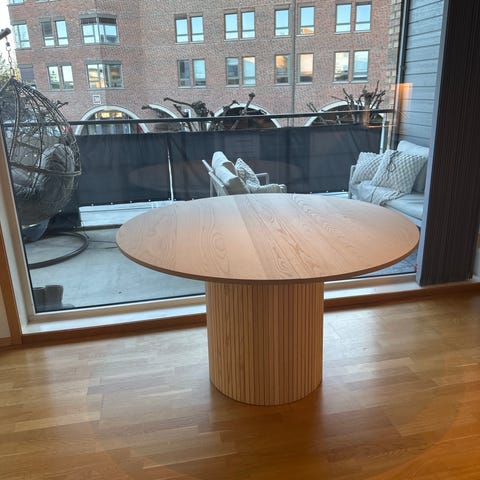 Spisebord Linea eik. Kjøpt hos Fagmøbler. Diameter 120cm. Høyde 75 cm. 2 stk klaffer a 45 cm følger med.