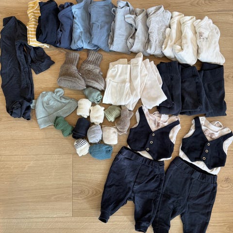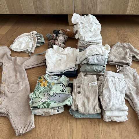 Nydelig pakke med klær i størrelse 62. Flere av bodyene har dobbel knepping i bunnen, som gjør at de passer lenge. Sender gjerne!