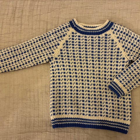 Lite brukt genser selges. Muligens str 3-4år. Se mål på bilde. Usikkert hvilken garn som er brukt.