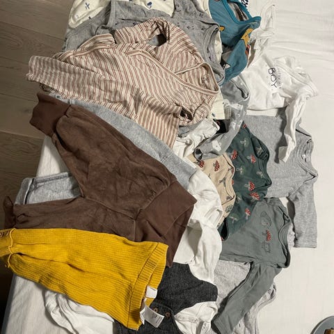 Uv sett fra Lindex er i størrelse 86/92. 5 bodyer med kort arm (noe flekker på disse etter utelek), tskjorte, sommerpysj, 2 shorts.