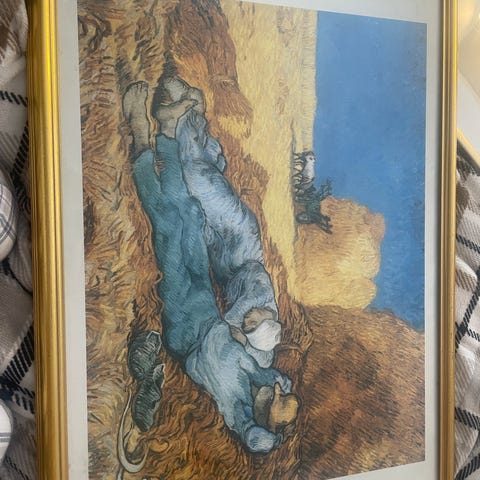 bilde med ramme. Motiv av tre personer ved et rekkverk ved vann, i malerisk stil med sterke farger. Bildet er innrammet i en lys, enkel ramme med passepartout. Egner seg som veggdekor i stue, gang, soverom eller andre oppholdsrom.