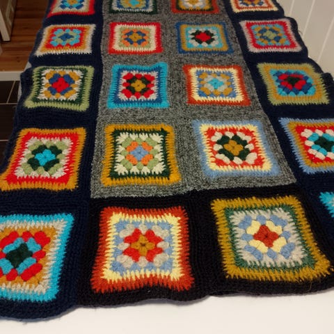 Håndheklet, i ren ull. Friske/tøffe farger.