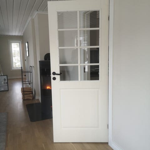 Innerdør med seks glassfelt i øvre del og tett fylling nederst. Døren er hvitmalt og har dørhåndtak og låssylinder. Passer som innvendig dør mellom rom der man ønsker lysgjennomgang samtidig som man skjermer noe for innsyn. Materialet er malt treverk med innfelte glassruter.