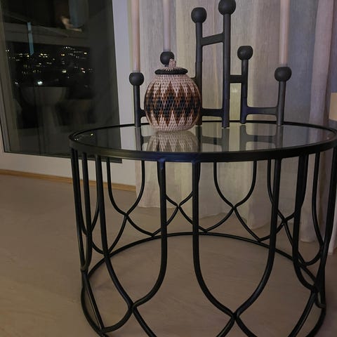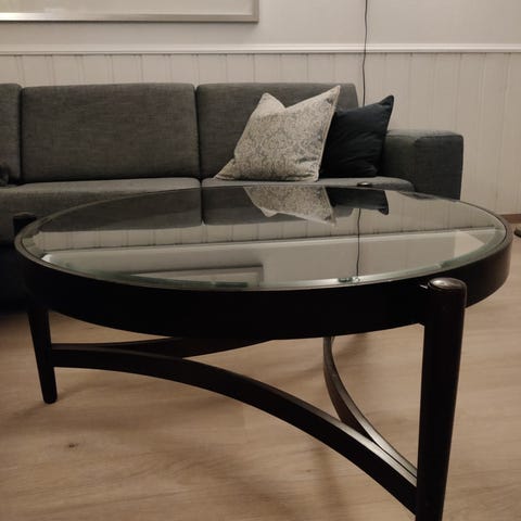 Pent brukt rundt stuebord, Agena fra Jotex. Kjøpt høst 2021. Enkelte skaper i overflaten av glasset (se bilde)