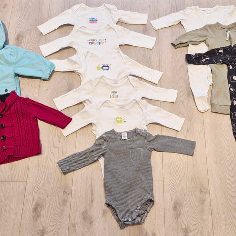 Klespakke str 80. Pent brukte klær. Ull, body, genser, bukser, pysjamaser og boblejakke.