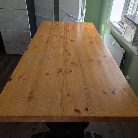 Spisebord uten stoler. Toppen er pusset ned og behandlet med naturlig olje