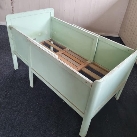 Liten gammel barneseng/skuvseng gis bort! Hadde planer om å pusse opp og lage en liten utesofa av den, men nå skal vi flytte, så derfor gir jeg den bort. Den er visstnok laget av møbelsnekker en gang i tiden og fin og solid, men gammel og sliten og trenger litt kjærlighet.