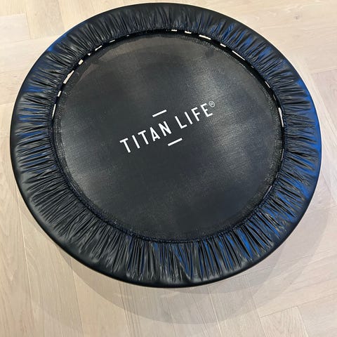 Titan Life trampoline i rund modell. Trampolinen har polstret kant rundt fjærene og flere ben for stabilitet. Egnet til innendørs trening eller lek, avhengig av størrelse og vektbegrensning oppgitt av produsenten. Farge hovedsakelig svart med Titan Life-logo på hoppeflaten.