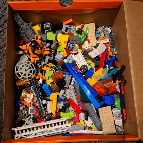 Diverse Lego deler, minifigurer bil, fly, og mer.