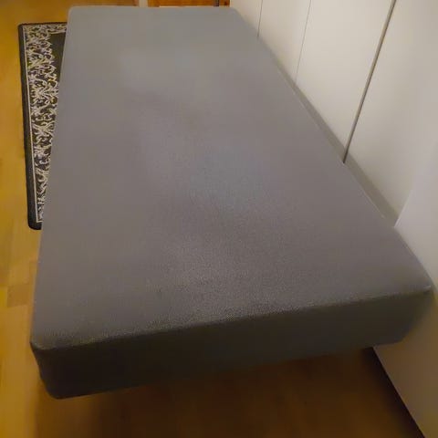 Pent og lite brukt Rrammemadrass i mørk grått stoff fra IKEA som har stått på gjesterom. 18cm høyde på føttene. Høyde på selve madrassen er 22cm.