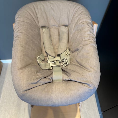 Stokke babysete i beige tekstil med integrert sikkerhetssele. Setet festes på Stokke-stol.