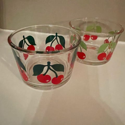 2x Glass beholder med kirsebær dekorasjon. Retro rock and roll.
