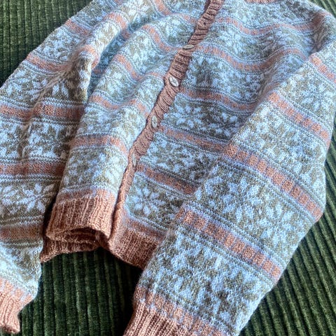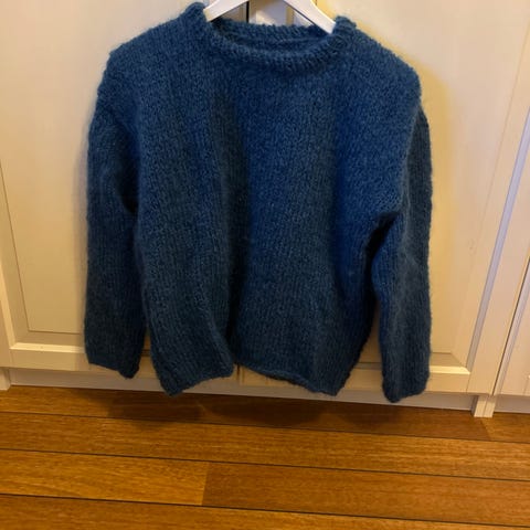 Myk og god, strikket på pinner nr 5 med tre tråder tynnt Mohairgarn og Alpakka