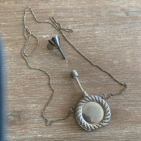 Brosje / pin med perler og steiner sølvfarget.