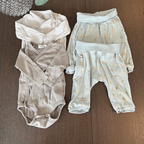 2 sett med body og bukse med det fineste kanin-printet💛 pent brukt av tvillinger💛 veldig drøy i bruk! (Ett sett i 62 og ett i 68, men brukte det om hverandre i både 62 og 68)💛