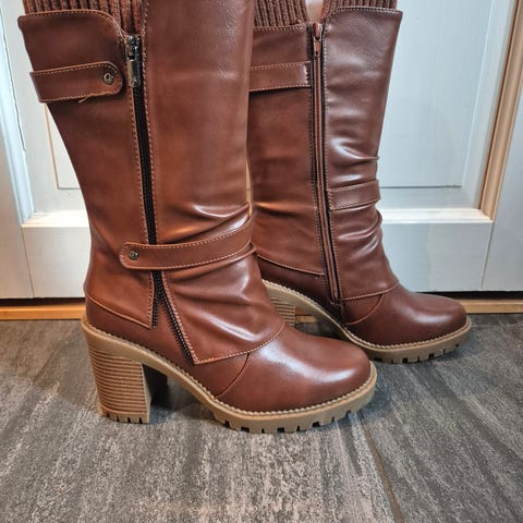 støvler i størrelse 38. Støvlene er i brun farge med kraftig hæl og grov yttersåle for godt grep. De har glidelås på siden for enkel av- og påkledning, samt dekorrem rundt ankelen. Øvre kant har ribbestrikket tekstilkant for ekstra komfort rundt leggen. Passer til bruk i kjøligere vær og til hverdagsantrekk.