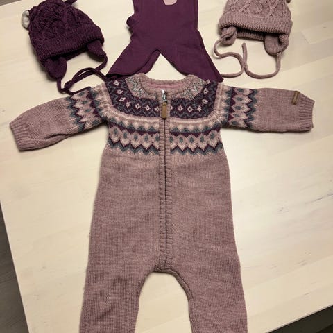 Rosa ullsett for babyjente i størrelse 62. Sett består av ulldress med glidelås, tilhørende ulllue og ekstra lue med øreklaffer og dusker. Mykt og varmt materiale som egner seg godt til bruk i vogn, bilstol eller inne på kjølige dager. Nøytral rosafarge som passer til mye annet barnetøy.