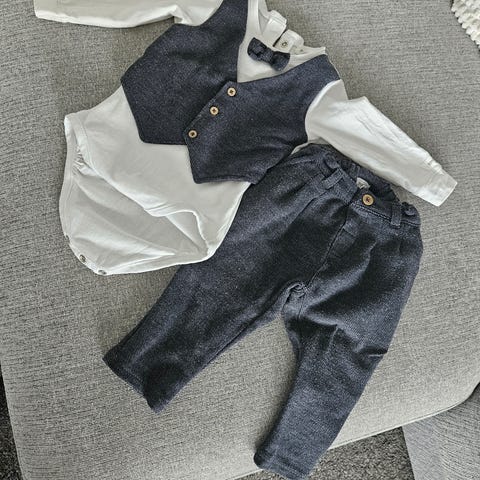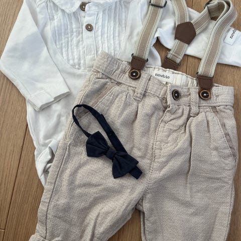 2 veldig fine sett fra Newbie med skjortebody, penbukse og bukseseler🤍 kun brukt noen timer i dåp av tvillinger 🤍