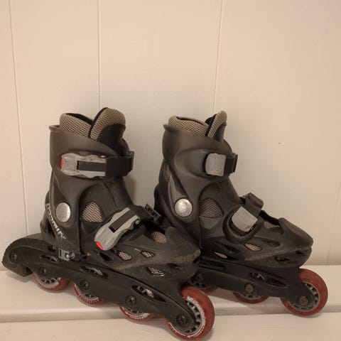 To par Rulleskøyter for barn i størrelse 38. Justerbar modell som dekker størrelsesområdet 35–38, der innstilt størrelse vises på siden av skøyten. Myk innersko kombinert med hard ytterskall for støtte rundt ankelen. Lukkes med spenner og stropp for god tilpasning til foten. Egnet til bruk på jevnt underlag som asfalt og lignende.